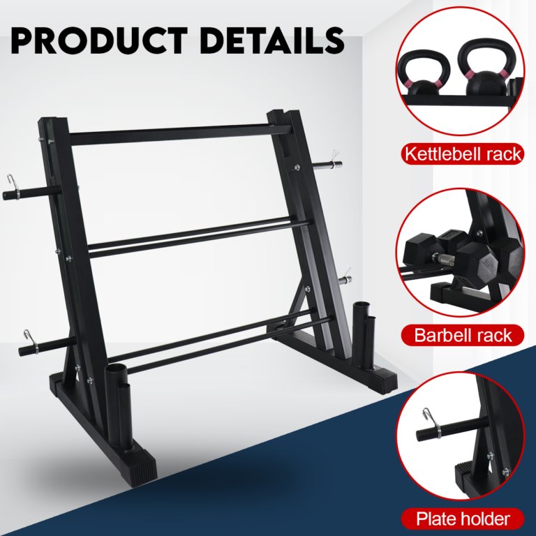 Multifunctional Rack is the ideal solution for home or gym, this rack helps keep all your essential tools in a safe, uniformed, and easy access racking system. You can put dumbbells, kettlebells weights, and barbells.